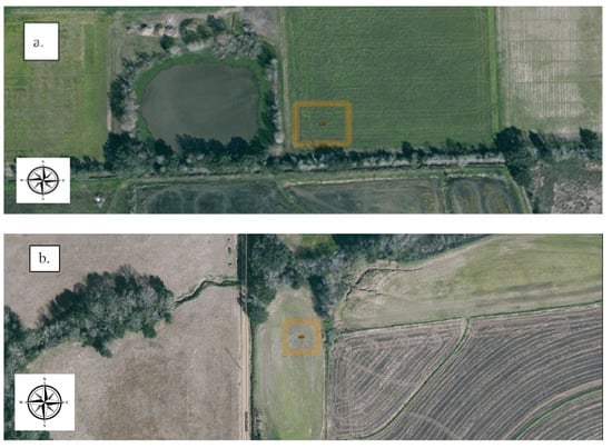Aerial view of (a) Midland silty clay loam (latitude, longitude: 30.175246° N, −92.358995° W) and (b) Acadiana silt loam (latitude, longitude: 30.251687° N, −92.341026° W) locations for 2021 and 2022.