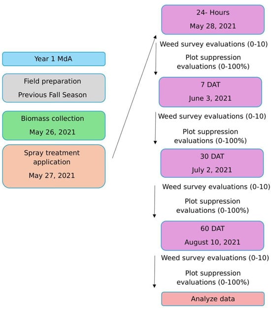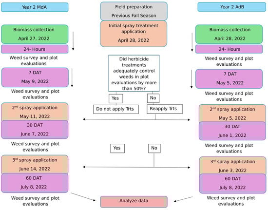 The experimental design for this study was a randomized complete block (RCB) design with each plot approximately 0.00056 ha−1 in size. Treatments were randomly assigned to each replication. Initial field preparation was prepared with a John Deere 7750 tractor (Deere & Company, Waterloo, IA, USA) with a 4.6 m Landoll plow at about 12.7 cm in depth. This was conducted to incorporate the previous year’s vegetative residue for each site during the fall season prior to treatment applications. This study included nine treatments consisting of four organic herbicides and four conventional synthetic herbicides, in addition to a control plot where no treatments were applied (Table 1). Application rates were determined based on label recommendations for each treatment at 57 L per hectare for Year 1 at 1.0 L ha water per treatment. Application rates were modified in Year 2 based on efficacy measurements made in Year 1 and additional research [12,13,16]. According to the literature, repeated spray applications, specific temperature requirements, high spray volume requirements, and controlling weeds during their early growth cycle should be considered when trying to increase the efficacy of organic herbicides on weed populations. In Year 2, synthetic treatments were applied at 57 L per hectare, and organic treatments were increased at 114 L per hectare at 1.0 L ha water per treatment compared to the 57 L per hectare of the previous year. Treatments were applied with a CO2 backpack sprayer and a three-tip (TJ8002) hand wand. For Year 1, treatment applications were applied on 27 May 2021. For Year 2, the number of applications was increased to improve the efficiency of the organic herbicide applications, which were applied based on weed control evaluations for each treatment (Table 2). With this in mind, herbicide treatment applications were adjusted in order to correctly evaluate organic herbicides in controlling target organisms. Regarding the dosage and organic treatments, Figure 2 presents the steps taken in Year 1 and Year 2 in regard to biomass collection, additional herbicide applications, and timed evaluations.