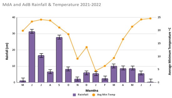 Monthly precipitation and average minimum temperatures recorded for MdA and AdB sites from 2021 to 2022 at the H. Rouse Caffey Rice Research Station Weather Station, Rayne, Louisiana.