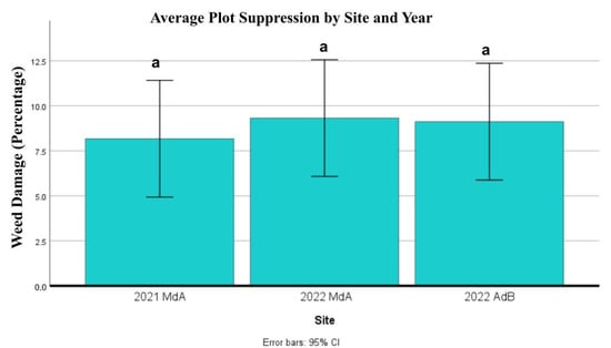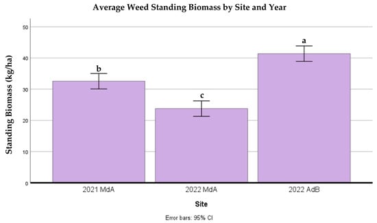 The volume of standing biomass in site 2 was somewhat expected in 2022. However, site 1 standing biomass decreased by 26% from 2021 to 2022. These results for site 1 were unexpected but may have been due to annual precipitation. Rainfall in Year 2 was significantly lower than in Year 1, which may have reduced seed germination and plant growth during the optimum growing season. Differences in the date of biomass collection between Years 1 and 2 could potentially have impacted results as well. Biomass was collected in Year 1 approximately one month later than in Year 2. The date change was implemented in Year 2 to increase the efficiency of the organic herbicides by applying treatments at an earlier growth stage. Although this helped with herbicide efficiency, younger plants would result in less available biomass for site 1 (33 kg ha−1 in 2021 and 24 kg ha−1 in 2022), and site 2 yielded the greatest biomass (41 kg ha−1) compared with site 1, which may be a result of increased weed species present at the time of data collection. Site MdA included 17 weed species, while site AdB had 19 weed species. Biomass data were not collected in Year 1 for this site, so there is no available information to determine if biomass differed between years.