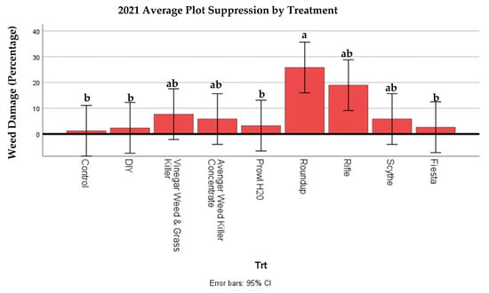Average damage percentage rating (0–100%) for organic and synthetic herbicides in 2021. Bars with different lowercase letters differ significantly across treatments (p < 0.05).