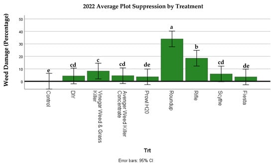 Average damage percentage rating (0–100%) for organic and synthetic herbicides in 2022. Bars with different lowercase letters differ significantly (p < 0.05).