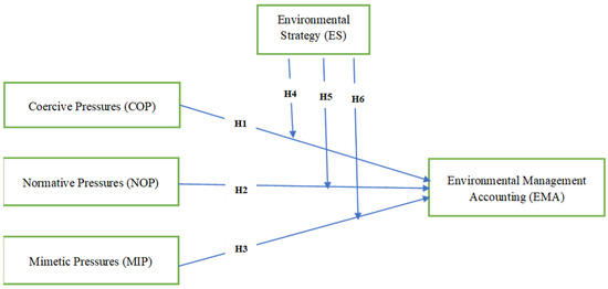 EMA focuses on providing both monetary and physical environmental information to optimize natural resource efficiency and mitigate environmental impact [25,26]. By revealing environmental costs often overlooked in traditional management accounting, EMA supports evidence-based decision-making for top management on environment-related issues [27,28]. EMA influences costing strategies, pricing mechanisms, and production decisions (including those focused on reducing hazardous waste generation) [26,29]. Ultimately, successful EMA adoption and implementation are linked to improvements in both environmental and overall firm performance. Yet, EMA implementation levels remain low with few organizations fully utilizing it for strategic decision-making [30]. This underscores a critical need to investigate the drivers of EMA adoption, especially in developing countries where research focus remains comparatively low [31,32,33]. Moreover, most existing studies draw on legitimacy, agency, and stakeholder theories to explain EMA adoption, with limited use of institutional theory [34]. This paper seeks to address these gaps by applying institutional theory to examine drivers of EMA adoption in Egypt. Specifically, the empirical focus is on whether coercive, mimetic, and normative pressures significantly influence EMA adoption decisions [33].