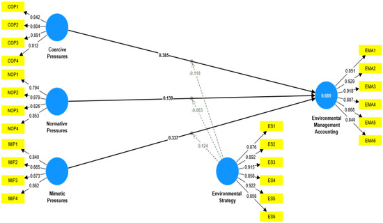 This paper examines the impact of institutional pressures (IPs) on Environmental Management Accounting adoption (EMA). The current research also aims to examine the moderating effect of environmental strategy (ES) on the relationship between IP and EMA. Data were collected from managers working in all registered Egyptian manufacturing companies (N = 491). The collected data were analyzed using smart partial least squares (Smart-PLS) software. The results revealed that there is a positive significant relationship between IP’s three components, namely, coercive, normative, and mimicry pressures, and EMA. The results also revealed that ES was found to moderate the relationship between IP and EMA. The study model was able to explain 68.9% of the variance in EMA adoption. The findings of this study serve as a pivotal yardstick for guiding corporate policy formulation, offering valuable insights to drive continuous improvements in EMA, environmental performance, and sustainable development. The present investigation extends the discourse on the role of IP and ES by revealing a substantial influence on EMA adoption. Positioned as one of the initial studies to delve into the moderating role of ES in the relationship between IP and EMA adoption, this research offers insights within an emerging market context.