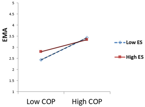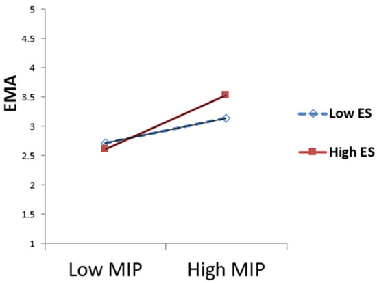 The investigation delved into the scrutiny of hypotheses related to the moderating influence of ES (ES) on the connection between IP and EMA. The outcomes affirmed support for H4 and H6, whereas H5 failed to attain statistical significance, evident in a p-value surpassing 0.05. The observed effect of ES on EMA was positive and significantly established (β = 0.069; t-value = 2.118). Concerning H4, which explores the moderating impact of the interaction between COP and ES (COP × ES), the outcome manifested as negative and statistically significant (β = −0.118; t-value = 2.124), as Figure 3 illustrates that the relationship between COP and EMA was shown to be diminished by ES. Conversely, H5, investigating the moderating impact of the interaction between NOP and ES (NOP × ES), did not achieve statistical significance (β = 0.063; t-value = 1.015). Additionally, H6, examining the moderating effect of the interaction between MIP and ES (MIP × ES), showed a positive and statistically significant result (β = 0.124; t-value = 2.233), as Figure 4 illustrates that the relationship between MIP and EMA was shown to be increased by ES. The calculated R2 value was 68.9%, indicating a high explanatory percentage and quality of the model, suggesting that the model explains 68.9% of the variance in endogenous constructs.