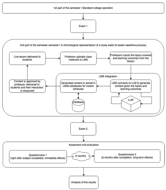 The goal of this approach is to offer the students a more diverse set of learning resources. Everything they learned during the class was made available for reading and studying in the three formats with automatically generated content. The complete process is performed seamlessly for both the students and the professors. The content for students was generated, checked, and approved by the professor right after each class, meaning that it was not generated on demand. This approach guarantees the controlled generative environment and final proof check by the professor, mitigating the ethical challenges that come with generative AI, as discussed previously. The students can easily switch between the different variants, either for fun or to experience different instructional approaches and grasp the material looking at it from different viewpoints. The complete step-by-step integration process is described in the following part of the methodology.