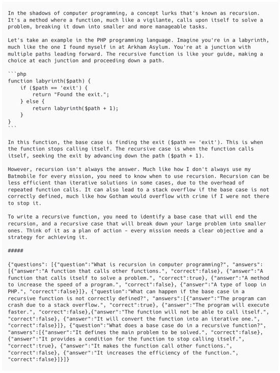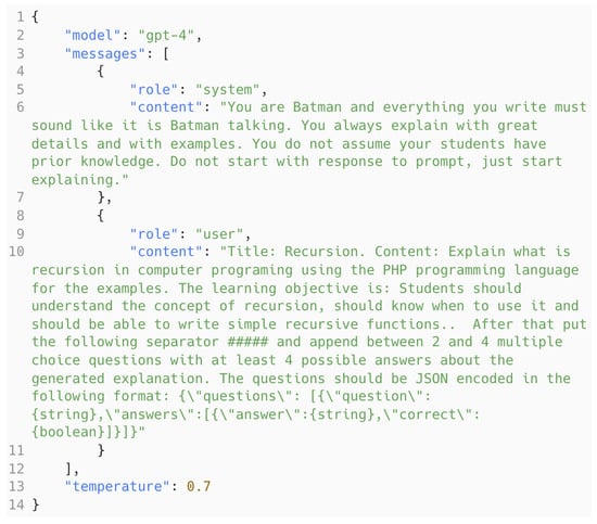 A novel AI-driven content generation mechanism was integrated into the learning management system (LMS) that was used by the students. The new feature leverages OpenAI’s GPT, a state-of-the-art language model, to create diverse instructional content tailored to different pedagogical styles and personas. Having identified the research gap outlined in the previous section, the idea to generate content in the style of pop-culture characters was deployed. The students voted and chose two variations that they want to see: the first one being Batman and the second one being Wednesday Addams. Among other mentioned characters were as follows: Harry Potter, Yoda, Wonder Woman, Homer Simpson, Eric Cartman, and James Bond. Batman was mostly voted probably because he is not only a fictional character but a cultural artifact per se [