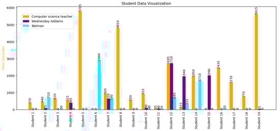 Figure 4, it is evident that the computer science teacher version is the most frequently viewed content variant. Although the students voted and decided which fictional characters would be made available, they were more interested in the most traditional style of the content. Upon analyzing the cumulative amount of time allocated to each variation by all the participating students in this study, we obtained the findings presented in