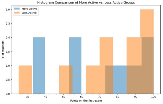 Figure 5, we compare the results on the first exam of students who would later belong in either the less active or the more active group, after introducing the AI-generated content variants. We use this approach in order to spot patterns in student achievement and to look for evident changes in student performance before and after introducing the proposed approach for automatic AI generation of learning materials. In