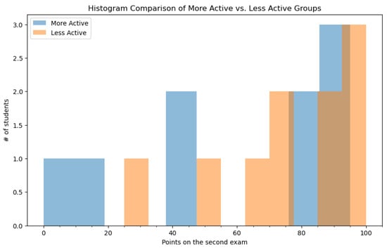 Figure 6 contains the results that students obtained on the second exam, after introducing the proposed approach. The more active and less active groups comprise the same students for reasons previously discussed. The data shown in this figure suggest that there is a slight improvement in points for students belonging to the more active group. The number of students who score over 80 points on the second exam is equal between the two groups in contrast to the first exam. On the other side, there are students from the more active group who scored poorly on the second exam, despite using access to proposed tool.