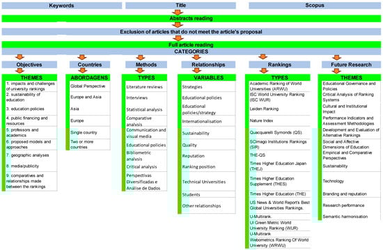 The defined categories are the objective of the articles, countries, type of university ranking studied, indicators used, variables related to university rankings, methods used and proposed future research.