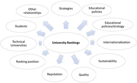 Other purposes of studies on university rankings addressed the themes of sustainability in education [13,14], policies in education [15,16,17,18,19], public financing and resources [20,21], and teachers and academics [22,23,24,25,26].