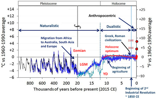 The Holocene Epoch, also called the Human Age, is a preeminent period of stable climate conditions enhancing significant socio-economic and cultural progress. For scientific and geological reasons, the Holocene is still in place. Due to significant technical progress, humans gradually moved their relationship with nature from a naturalistic type to a dualistic type until the beginning of the Second Industrial Revolution in 1850 (Figure 1). This means the coexistence of human respect for nature with resistance against natural forces. A typical example of this dualistic behavior from ancient Greece is the perception of the Acheloos River, which was considered to be a demigod and, at the same time, a giant snake defeated by Hercules for producing catastrophic floods [33].