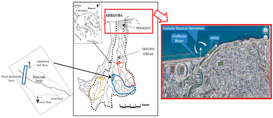 Dialectical RBMPs [47] aim to harmonize human behavior with natural laws, by dialectically unifying the two opposites: conflict and cooperation. Because opening the floodplain by removing the population was very difficult, the inhabited area along the river was protected from flooding. As shown in Figure 7, a system of flood detention reservoirs was provided for retaining the 20-year flood peaks upstream. Also, to attune the RBMPs with natural laws, a jetty was constructed at the river’s mouth (Figure 7) to facilitate the evacuation of solid sediments into the sea via a dextral Coriolis forces deviation [47].