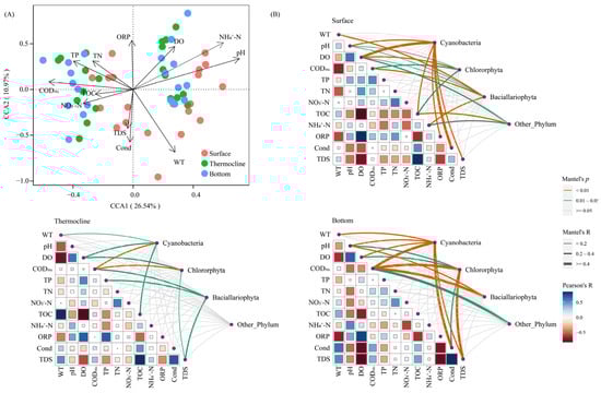 - Jiao, C.; Zhao, D.; Zhou, T.; Wu, Q.L.; Zeng, J. Habitat-specific regulation of bacterial community dynamics during phytoplankton bloom succession in a subtropical eutrophic lake. Water Res. 2023, 242, 120252. [Google Scholar] [CrossRef] [PubMed]
