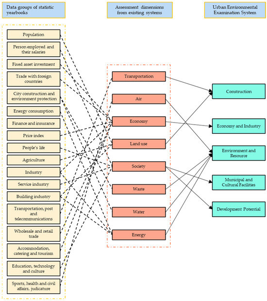 The assessment system for urban physical environment examination classifies structural and non-structural environments into eight dimensions: ecological livability, urban characteristics, transportation, life comfort, diversity and inclusion, safety and resilience, innovative vitality, and people’s satisfaction. Linking the solution to data unavailability in the implementation of urban physical environment examination systems [49], this study begins with key focuses (18 categories reported in the statistics yearbooks, yellow column on the left side of Figure 1) of national, regional, and local governments to track urban sustainability progress while respecting multiple sustainability dimensions. Most indicators in these 18 categories can be attributed to the eight aspects of existing assessment systems [30]. For example, indicators of urban construction and environmental protection can be grouped into land use, waste, and water. The building industry can be categorized into land use and energy aspects. These eight aspects can be further categorized into five dimensions. For example, transport and land use can be grouped into construction dimensions, while air, waste, and energy can be categorized into environmental dimensions. Overall, this study summarizes five dimensions (D1–D5): construction (D1), economy and industry (D2), environment and resource (D3), municipal and cultural facilities (D4), and development potential (D5) (Figure 1).