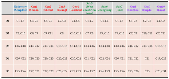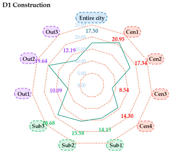 Figure 4 shows the urban sustainability scores of the entire city of Qingdao and its ten districts with respect to construction (D1). Overall, the city score was 17.50. Three districts performed better than the entire city, with higher score of 20.95 (Shinan, Cen1), 18.68 (Jimo, Sub3), and 19.64 (Pingdu, Out2). These three districts belong to the central city, suburban area, and outer suburban area. Cen3 and Out1 had the lowest sustainability values in the construction dimension of approximately 8.54 and 10.09, respectively. This result suggests that Licang (Cen3) and Jiaozhou (Out1) must take effective action to improve construction sustainability. The scores of other districts, such as Laoshan (Cen4), the West Coast New Area (Sub1), Chengyang (Sub2), and Laixi (Out3), ranged between 12 and 16.