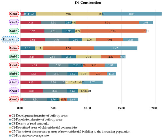 Figure 15 presents indicators with low sustainability scores. For D1, C1—development intensity of built-up areas, C2—population density of built-up areas, C4—retrofitted areas of old residential communities, and/or C5—the ratio of the increasing areas of new residential buildings to the increasing population constrained the construction sustainability of the central city area. In comparison, the C6—fire station coverage rate limited the construction sustainability of districts in suburban areas. C4—retrofitted areas of old residential communities and/or C6—fire station coverage rates were barriers to the outer suburban areas. For D2, the C7—local gross domestic product (GDP) growth rate, C8—local GDP per capita, and/or C10—size of high-tech industries were barriers to the economic sustainability of the central city area. C9—percentage of tertiary sector, C11—growth rate of fixed assets investment, and/or C12—electricity consumption per unit of GDP were the main barriers to economic sustainability in suburban and outer suburban areas.