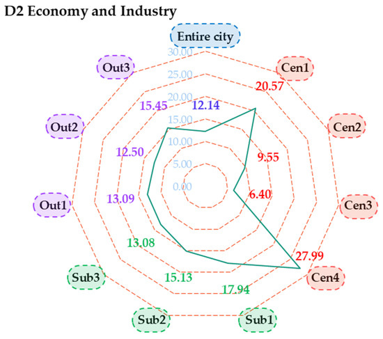 Figure 6 presents the urban sustainability scores of the entire city of Qingdao and its ten districts with respect to the economy and industry dimension (D2). Overall, the sustainability score of the economy and industry for the entire city of Qingdao was 12.14, far lower than the construction sustainability score of 17.50, suggesting the potential and need to further improve economy sustainability. Among ten districts, eight districts including Shinan (Cen1), Laoshan (Cen4), West Coast New Area (Sub1), Chengyang (Sub2), Jimo (Sub3), Jiaozhou (Out1), Pingdu (Out2), and Laixi (Out3) had higher scores than the entire city. Typically, Shinan (Cen1) and Laoshan (Cen4) were the most prominent drivers to the economy sustainability in Qingdao, with the scores of 20.57 and 27.99, respectively. Only Shibei (Cen2) and Licang (Cen3) had lower scores, about 9.55 and 6.40, suggesting the need to improve economy sustainability whilst they are in the central city areas.