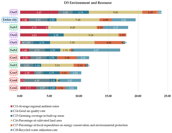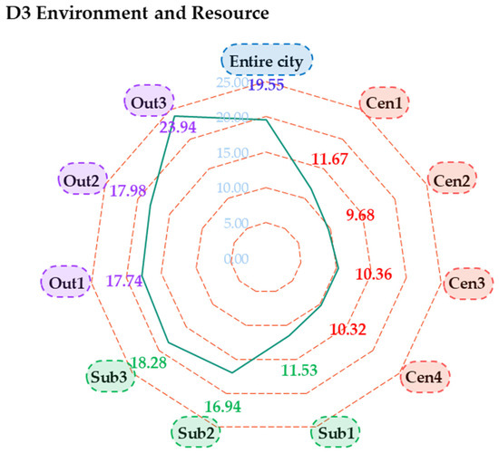 Figure 8 analyzes the urban sustainability scores of the entire city of Qingdao and its ten districts with respect to the environment and resource dimension (D3). The entire city of Qingdao received a score of 19.55, and only one district, Laixi (Out3), received a higher score (23.94) than the entire city. For all other districts, the scores were lower, and the central city districts of Shinan (Cen1), Shibei (Cen2), Licang (Cen3), and Laoshan (Cen4) received lower scores of 11.67, 9.68, 10.36, and 10.32, respectively, compared to the suburban and outer suburban districts of the West Coast New Area (Sub1), Chengyang (Sub2), Jimo (Sub3), Jiaozhou (Out1), and Pingdu (Out2), approximately 11.53, 16.94, 18.28, 17.74, and 17.98, respectively. Overall, urbanized districts face more severe environmental challenges.