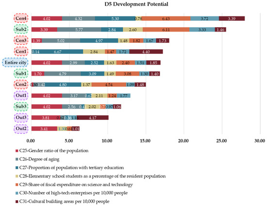 Figure 12 analyzes the urban sustainability scores of the entire city of Qingdao and its ten districts with respect to the development potential dimension (D5). The entire city of Qingdao received a score of 16.93 in D5, and four districts received higher scores than the entire city. They were Shinan (Cen1), Licang (Cen3), Laoshan (Cen4), and Chengyang (Sub2), and values were 17.24, 18.07, 27.96, and 25.50, respectively. In comparison, the development potential levels of Jimo (Sub3), Jiaozhou (Out1), Pingdu (Out2), and Laixi (Out3) were generally low, with values of 11.77, 12.99, 6.33, and 10.13, respectively. These results may indicate that well-urbanized districts had good development potential. However, the score for Shibei (Cen2) was only 15.01, whereas that for the West Coast New Area (Sub1) was 16.86.