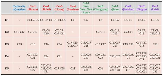 For D1, Shinan (Cen1) was the only district in the central city area that performed better than the entire city, whereas Jimo (Sub3) and Pingdu (Out2) in suburban and outer suburban areas, respectively, could also perform better than the entire city. However, all other districts performed worse in terms of construction sustainability than the entire city. For D2, Shibei (Cen2) and Licang (Cen3) performed worse than the entire city, but all other districts, regardless of area difference, performed better than the entire city in terms of economic sustainability. For D3, districts in suburban and outer suburban areas received higher scores than those in the central city area. This suggests that urbanization has led to environmental deterioration, especially in built-up areas. For D4, districts in suburban areas that are under rapid urbanization performed the worst in terms of cultural sustainability. Highly urbanized districts in the central city area perform the best in terms of cultural sustainability. This means that well-urbanized districts have advantages in terms of cultural facilities and services, while cultural infrastructure is generally neglected in developing areas. For D5, well-urbanized districts gained strength, whereas less-urbanized districts in outer suburban areas had the worst development potential. Overall, the transition from less-urbanized to well-urbanized districts may lead to environmental deterioration and economic growth deceleration (if industries are not well upgraded), but cultural sustainability and development potential can be improved.