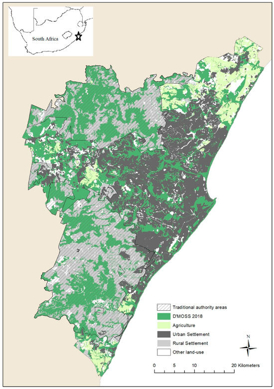 The socio-economic context of Durban, with a high degree of inequality (Gini co-efficient = 0.62) and more than a third of the population living below the poverty line [25], further exacerbates pressure through growing informality and the increasing reliance on natural resources [24]. In addition, the availability of land to support the economic activities associated with one of sub-Saharan Africa’s busiest ports [27] is limited by, inter alia, the steep topography that characterises the city, placing additional pressure on threatened habitat types (e.g., grassland systems) that are typically associated with the flatter more “developable” areas [24]. An additional complexity in Durban is the presence of a dual governance system for the administration of land use, viz. formal municipal scheme areas that are administered by the eThekwini Municipality and traditional authority areas administered by the Ingonyama Trust Board (ITB) [24] (Figure 1). The latter, reflective of the legacy of spatial segregation, represents land held in trust for the former KwaZulu homeland area, with the Zulu King as the sole trustee [28].