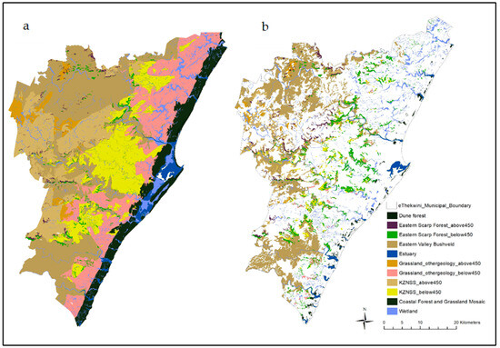 Mapping the city’s land cover had relied on national and provincial vegetation mapping in order to assign vegetation types to the mapped land-cover units. This led to significant scale-related issues, as there were many cases in which assigned vegetation types did not match with what was present on the ground. In order to address this issue, using more detailed Durban specific data sets (e.g., fine-resolution geology and 2 m contour shapefiles), a fine-scale vegetation map was produced for Durban (Figure 2). This product would represent a key input into Durban’s Systematic Conservation Assessment [22], the outputs of which would inform the substantive additions to the 2016 iteration of the D’MOSS.