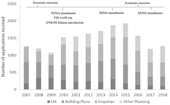 Policy and legislative changes also influenced the overall numbers. The adoption of D’MOSS as part of the town planning schemes, for instance, played a role in the increase from 2009 to 2010 in the total number of applications, particularly with the number of enquiries and other planning applications received over the respective years. The number of EIAs received were also directly related to changes in NEMA regulations and, in particular, changes to the thresholds for “triggering” NEMA processes. Major changes to the regulations took place in 2010 and 2014, and in both instances, the number of EIAs received decreased, which may be related to relaxations of thresholds for certain listed activities (e.g., road construction) and the exemption of certain listed activities (e.g., pipelines transporting water, sewage and storm water) within urban areas [60]. The inclusion of D’MOSS within schemes in 2010 has provided a necessary safety net in assessing impacts that no longer meet thresholds triggering NEMA processes and ensuring that important biodiversity features were not being compromised by “death by a thousand cuts” as a result of the cumulative impact of small-scale development applications [20].