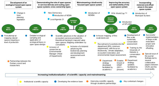 This paper documents the evolution of Durban’s open space planning over the past 40 years and contributes to addressing the paucity of research in this field from countries of the Global South [61,62]. Through the analytical frameworks, there is evidence of the advancement of mainstreaming biodiversity concerns within local government processes, institutional functions and land-use decision-making. This has been achieved through effective and sustained leadership; the use of science and scientific information in advancing the policy and legislative environment and building political support by responding to shifting governance contexts; investment in institutional scientific capacity, and generating scale-appropriate biodiversity information (Figure 4). These are areas that are typically seen as barriers to implementing urban biodiversity planning [63], and where Durban’s biodiversity function has invested sustained resources and displayed innovation in addressing challenges.