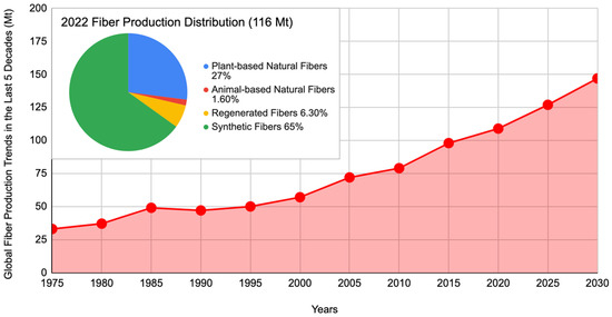 Figure 2. Increasing trend in overall global fiber production rates in Mt (million tons) from 1975 to 2022 with estimated projection through 2030. The inner pie chart shows the overall market share of each of the main fiber categories [6].