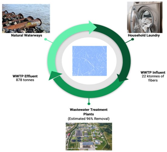 Figure 4. Annual MF influent from home laundering and post-treatment effluent released in the environment in Northern America [47] (images are copied from pixabay.com under CC0 license).