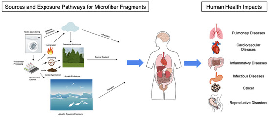 During the use and care phases of garment life cycles, the release of MFs into the atmosphere leads to their dispersion in both indoor and outdoor settings [82,88,89]. Within indoor environments, MFs may descend to the floor [90], contaminate food [91], be inhaled through their presence in the air we breathe, and be transported to our respiratory system [69,92]. Conversely, outdoor-released MFs are prone to long-distance transport by atmospheric fallout through wind, rain, and stormwater [93], reaching other places [88,93,94].