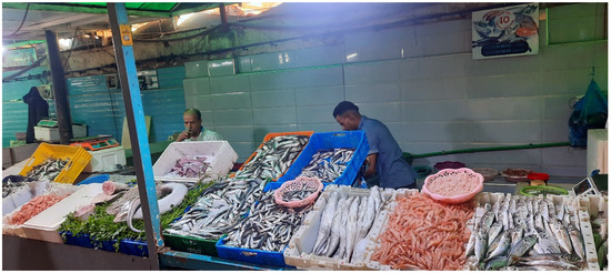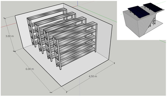 The objective of this research is to develop a simulation model for a cold room in the local market of Fez, Morocco (33.9° N/−5.0° E), specifically designed for fish storage in 10 selling stands as presented in Figure 1. The proposed refrigerated storage unit is a standard container with dimensions of 6 m × 4.5 m × 3 m. These dimensions were determined based on on-site surveys, which indicated that each of the local market’s fish merchants sell an average of 200 kg of fish daily. The storage capacity is organized into 4 rows, as depicted in Figure 2. A flowsheet displaying the different steps of this research can be seen in Figure 3.