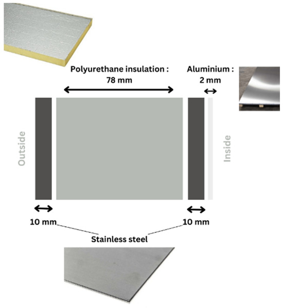 The walls, roof, and floor of the cold room are constructed using stainless steel with polyurethane insulation, a commonly utilized material in food storage units [35,36,37], as illustrated in Figure 4. The walls consist of four layers, namely stainless steel, polyurethane, stainless steel and aluminum, with the properties shown in Table 1.