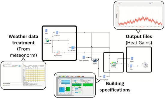 To overcome the limitations posed by conventional computation techniques that rely on steady-state formulas, TRNSYS 16 [38] software was employed to generate a more accurate estimation through dynamic thermal modeling of the cold room. Figure 5 presents the flowsheet of the following simulation methodology in TRNSYS 16.