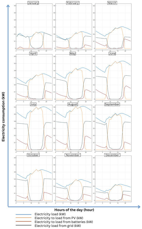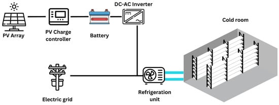 These values, along with the PV module’s capacity, serve as input. The software uses these inputs to simulate the behavior of the PV array. The software algorithm takes into consideration the power generated by the PV and then compares it with the electric load. If there is an excess of energy generated, it is stored in the battery, and if electricity is needed, it can be then extracted either from the batteries or directly from the grid. It is important to emphasize that in this study, the refrigeration system used is a conventional vapor compression cycle that employs R134a refrigerant and has a coefficient of performance of 2.7.