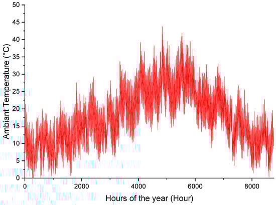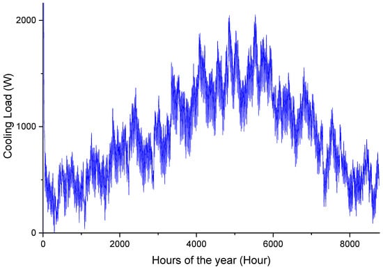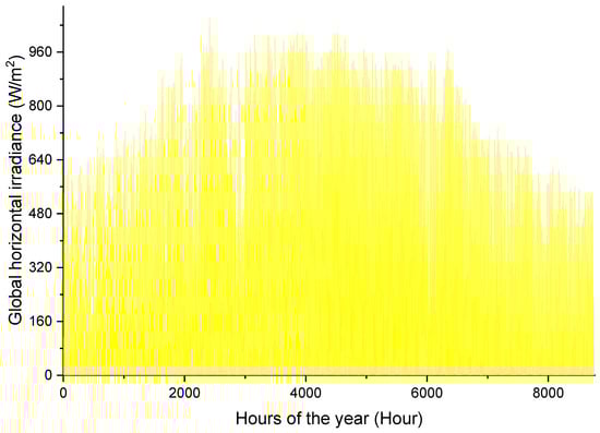Using TRNSYS 16, Figure 7 displays the hourly cooling load of the cold room in Fez, Morocco. As expected, the outcomes demonstrate that the cooling load rises during the hotter months of the year, making it favorable for energy systems that rely on solar power generation because irradiation is more prevalent during the warm periods, as shown in Figure 8. Figure 9 represents the ambient temperature for all hours of the year. It can be observed that the heat load follows a similar pattern to the ambient temperature, indicating that the ambient temperature significantly influences the cooling load.