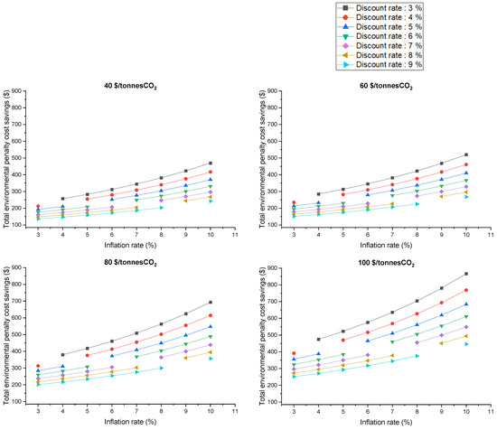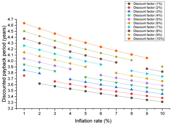 Payback time can be defined [48] as the duration needed for the cumulative savings to become equal to the total initial investment. It is a technique that measures the economic performance of an investment. Specifically, the discounted payback period presents the number of years required to pay back the initial capital while discounting future cash flows and the rate of inflation (iinf). The discount rate plays a crucial role in determining the present value of future cash flows from the project. It reflects the cost of capital, or the expected return on investment, and takes into account factors such as inflation, risk, and the time value of money. DPP (discounted payback period) can be calculated as [49] follows [49]: