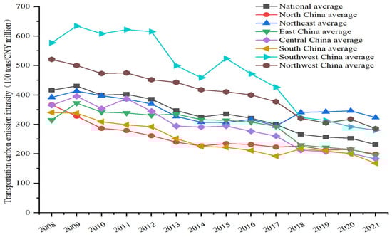 Based on Formula (1), this paper measured the transportation carbon emission intensity of 31 provinces in China from 2008 to 2021. This study drew an evolution trend map for the entire country, as well as for Northeast China, North China, East China, Central China, South China, Southwest China, and Northwest China. Among them, based on the division of topography and climate, Northeast includes Liaoning, Jilin, and Heilongjiang; North China includes Beijing, Tianjin, Hebei, Shanxi, and Inner Mongolia; East China includes Shanghai, Jiangsu, Zhejiang, Shandong, and Anhui; Central China including Hunan, Hubei, Henan, and Jiangxi; South China includes Guangdong, Guangxi, Hainan, and Fujian; Southwest China includes Sichuan, Chongqing, Guizhou, Yunnan, and Tibet; and Northwest China includes Shaanxi, Gansu, Xinjiang, Qinghai, and Ningxia. Figure 1 shows that the national average transportation carbon emission intensity decreased from 416 tons/CNY million in 2008 to 336 tons/CNY million in 2015, and then to 232 tons/CNY million in 2021. This suggests a year-over-year decrease in transportation carbon emission intensity in China and a positive trend of transportation carbon emission reduction.