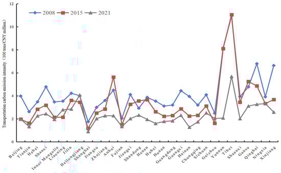 Time evolution trend of transportation carbon emission intensity in Chinese provinces in 2008, 2015 and 2021.