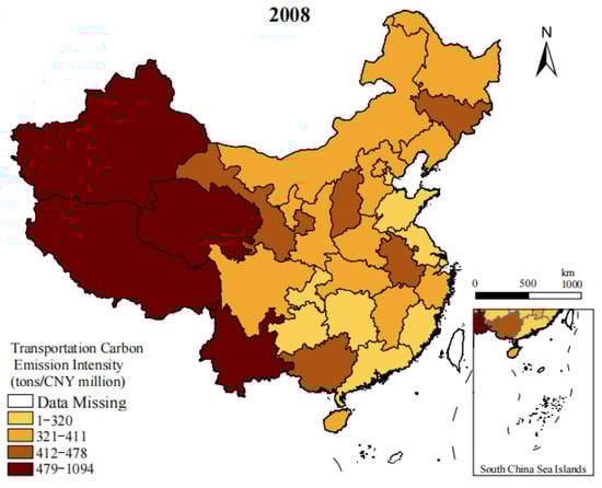 Spatial evolution pattern of transportation carbon emission intensity in China (2008).