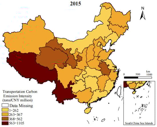 Spatial evolution pattern of transportation carbon emission intensity in China (2015).