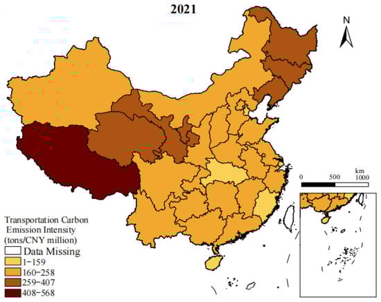 Spatial evolution pattern of transportation carbon emission intensity in China (2021).