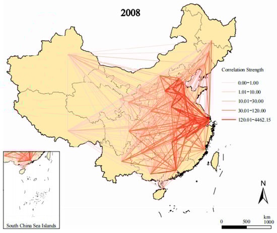 This paper aimed to visually depict the spatial characteristics of China’s transportation carbon emission intensity’s spatial correlation network. This study visualized the spatial network correlation strength of transportation carbon emission intensity in Chinese provinces in 2008, 2015, and 2021 (Figure 6, Figure 7 and Figure 8). This study’s findings indicate that the spatial correlation network of transportation carbon emission intensity in Chinese provinces shows the characteristics of uneven interweaving and high complexity, with prominent spatial non-equilibrium and a spatial distribution pattern of “dense in the East and sparse in the West”.
