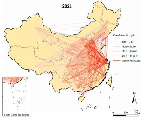This study calculated the spatial network correlation number and density of transportation carbon emission intensity. The results revealed that between 2008 and 2021, the network correlation number of transportation carbon emission intensity showed a trend of fluctuating evolution, with values of 249 in 2008, 265 in 2015, and 261 in 2021. The network density also indicated a trend of fluctuation, with values of 0.2677 in 2008, 0.2849 in 2015, and 0.2816 in 2021. These values demonstrated a certain degree of stability. However, when looking at the correlation strength, the national average transportation carbon emission intensity correlation strength was 35.81 in 2008, 195.62 in 2015, and 495.19 in 2021. This indicates that China’s spatial correlation network of transportation carbon emission intensity is becoming more and more closely connected.