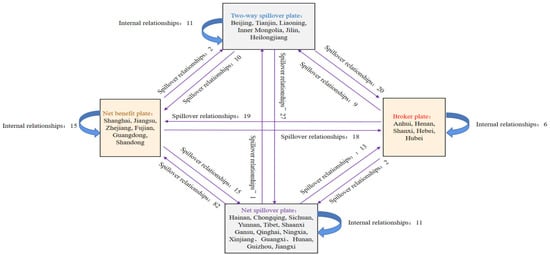 The block model is a technique used to classify network nodes and identify their specific roles based on the characteristics of the relationship network [57]. It involves comparing the expected ratio of internal relationships with the actual ratio of internal relationships. Each node can be classified into four plates: “two-way spillover”, “net benefit”, “broker”, and “net spillover”. Among them, the “two-way spillover” plate means that members of this plate have more spillover relationships to other plates and within the plate; the “net benefit” plate means that the number of relationships that this plate receives from other plates is much greater than the number of relationships that it has spilled out of the plate; the “broker” plate means that members of this plate both receive and send out more relationships to other plates, playing the role of intermediaries and bridges in the network; and the “net spillover” plate means that members of this plate have significantly more spillover relationships with other plate members than they receive from different plates.