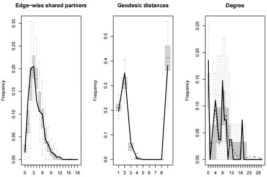 To evaluate the effectiveness of the fitting of a network, it is important to observe certain statistics. Figure 10 displays the results of observing three crucial statistics. The black line in the diagram represents the actual network, while the box plot depicts a random network. Upon analyzing the fitting graph of edge-wise shared partners, it is evident that the black line is mostly positioned close to the middle of the box diagram, indicating satisfactory fitting results. Similarly, the fitting of geodesic distances and degree also prove to be ideal.