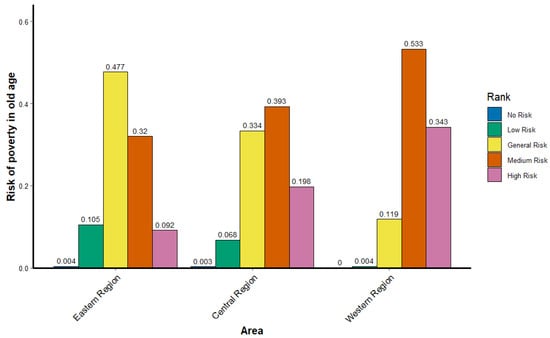 The respondents’ regions were divided into three parts according to geographical location—eastern region, central region, and western region—and the risk of elderly people becoming poor was calculated, respectively [20]. The comparison results are shown in Figure 3. In the overall dimension of 2020, the risk of poverty among China’s elderly population presents a distribution of “high in the middle and low on both sides”, and more than half of the elderly respondents’ risk of poverty is a general risk, which indicates that the risk of poverty among most elderly people is still in a controllable stage. From a regional perspective, the risk of poverty among the elderly in the eastern region is lower than that in the central and western regions, and it is preliminarily believed that the risk of poverty among the elderly is related to the development level of local economy, science, and technology.