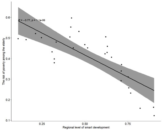 In order to preliminarily understand the relationship between regional smart development and elderly poverty risk, we took the calculated risk value of elderly poverty risk in each province of China and conducted a correlation analysis of the two. The results showed that there was a certain correlation between the two (Figure 4).